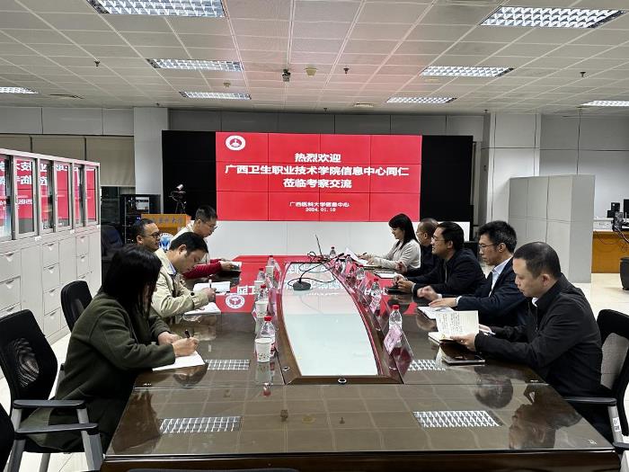 2024年1月10日上午,广西卫生职业技术学院信息中心副主任姚波一行4人来我校信息中心进行多校区智慧校园建设交流。交流会在校本部信息中心办公室举行,我校信息中心主要领导和相关业务科室负责人参加了交流。会议由信息中心主任陈榆主持。